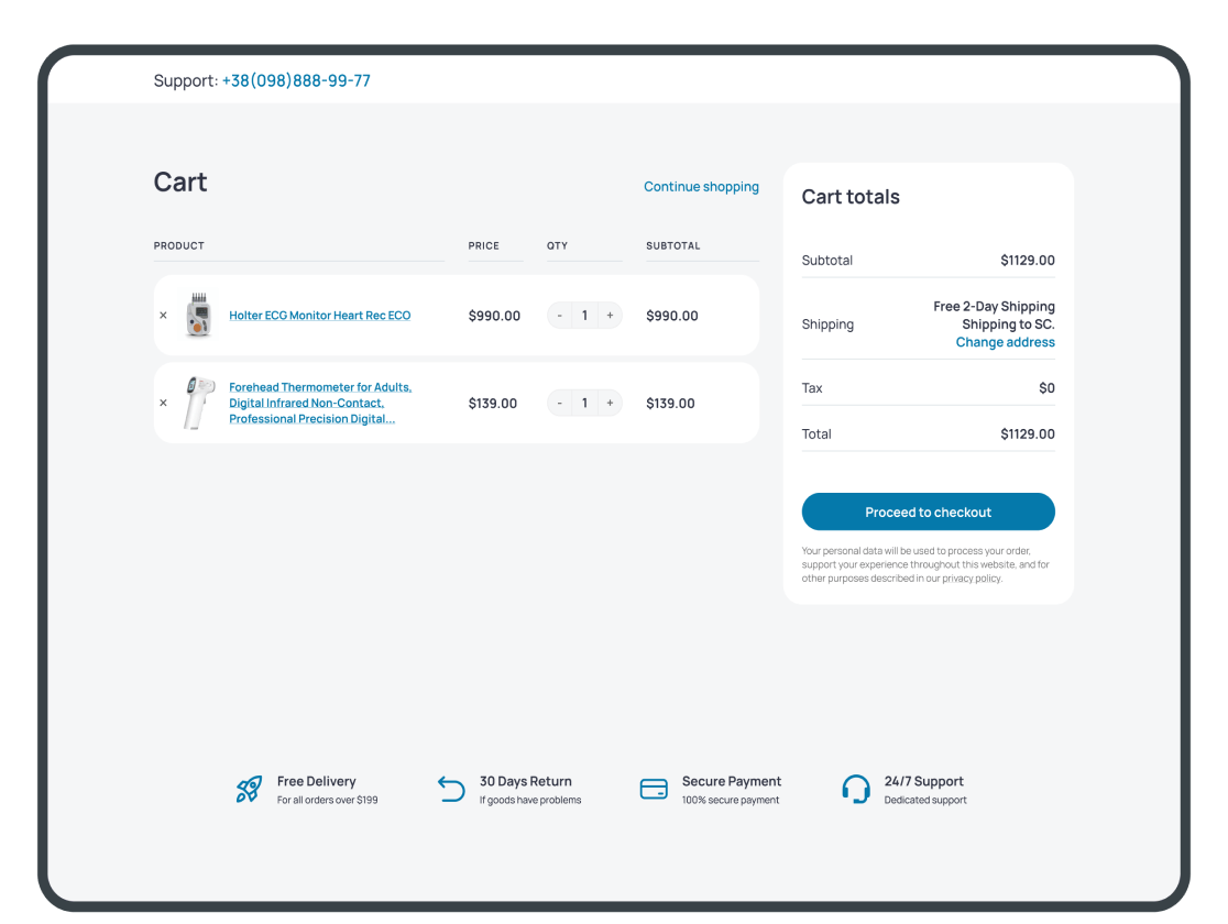 Webshop and user profile functionality allows our customer to sell the IoT healthcare solution online. Our tech team has created a web-based e-commerce solution and integrated it with the company's site. The end users can define payment methods, create orders, pass checkouts, then track orders' statuses.