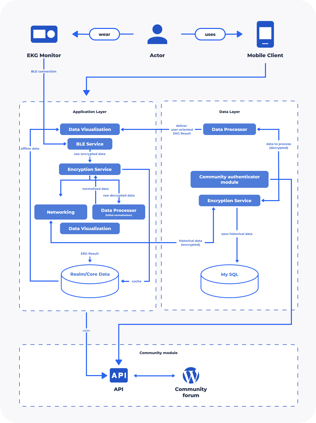 - The solution’s core is iOS and Android mobile applications connected to IoT devices via Bluetooth. The overall communication process between hardware and app is encrypted (AES-256), so end users can securely track their PHI received from a wireless portable EKG monitor and/or pulse oximeter (consumers can buy and use one or both devices).