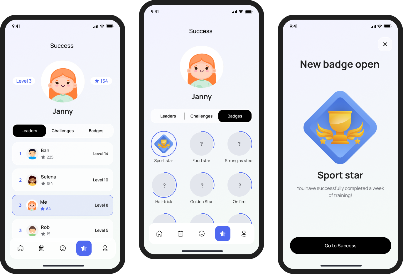 Gamification elements keep young users engaged in the training process. They include achievements, animations, and emotions. Animations use a user-selected character to show children how to properly do each exercise to get a good result. Also, users can set their current feelings, and their characters will display them and match the kids with activities based on their moods.