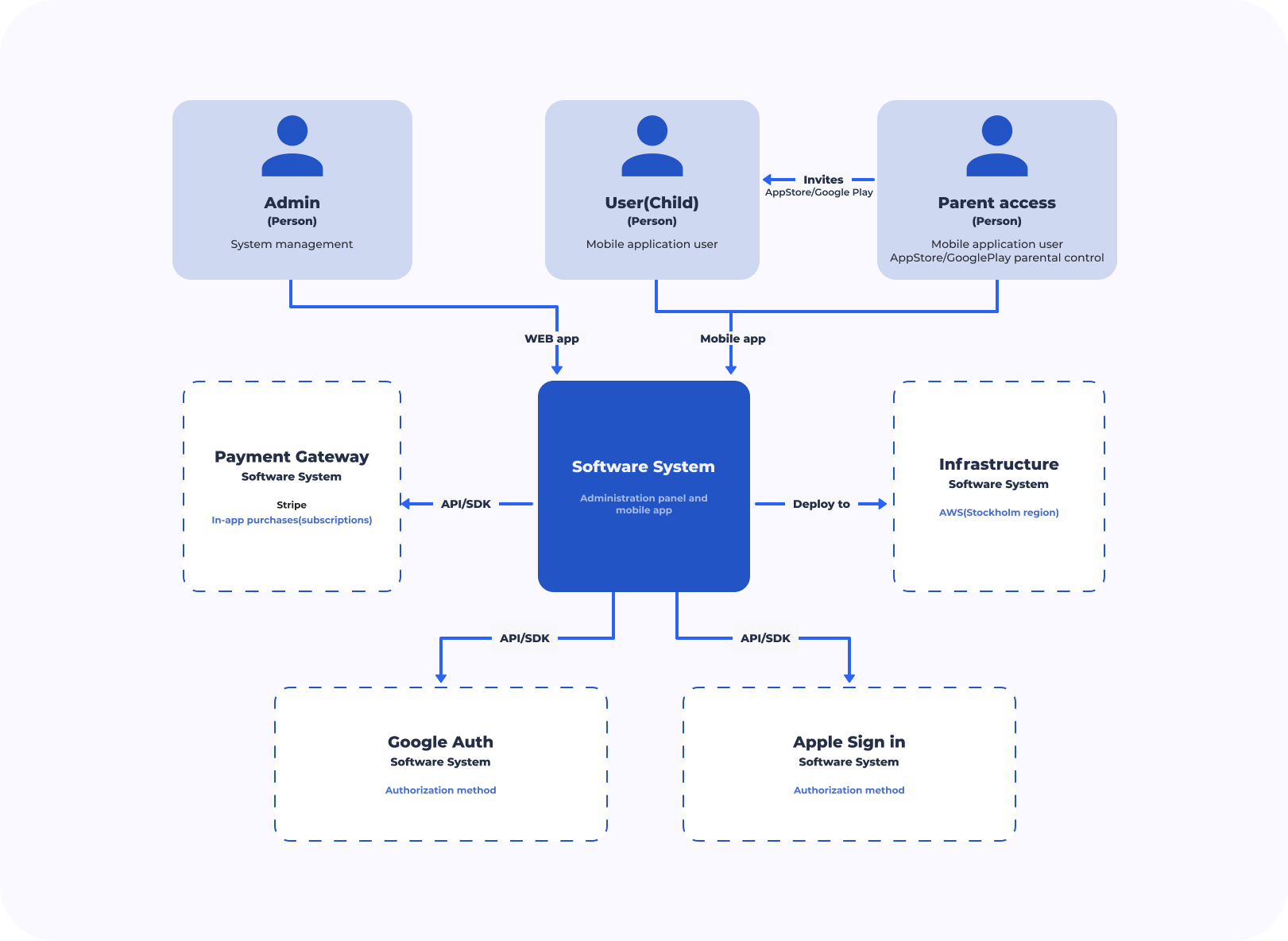 - During the Discovery Phase, we used appropriate tools to define the scope and plan the project's progress. During this phase, our team detailed all requirements for the app architecture, identified a set of MVP features (for a quick product release), and defined key differentiating features: Parental Controls and Gamification elements. Also, since the app handles personal user data, we created a plan for proper development according to the security requirements, namely GDPR.