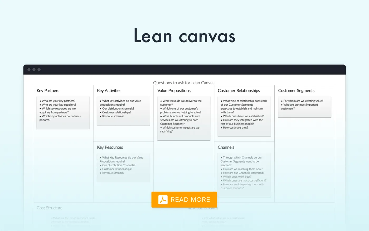 Lean Canvas is basically a one-page tech startup business plan helping you to break down your idea into key assumptions.