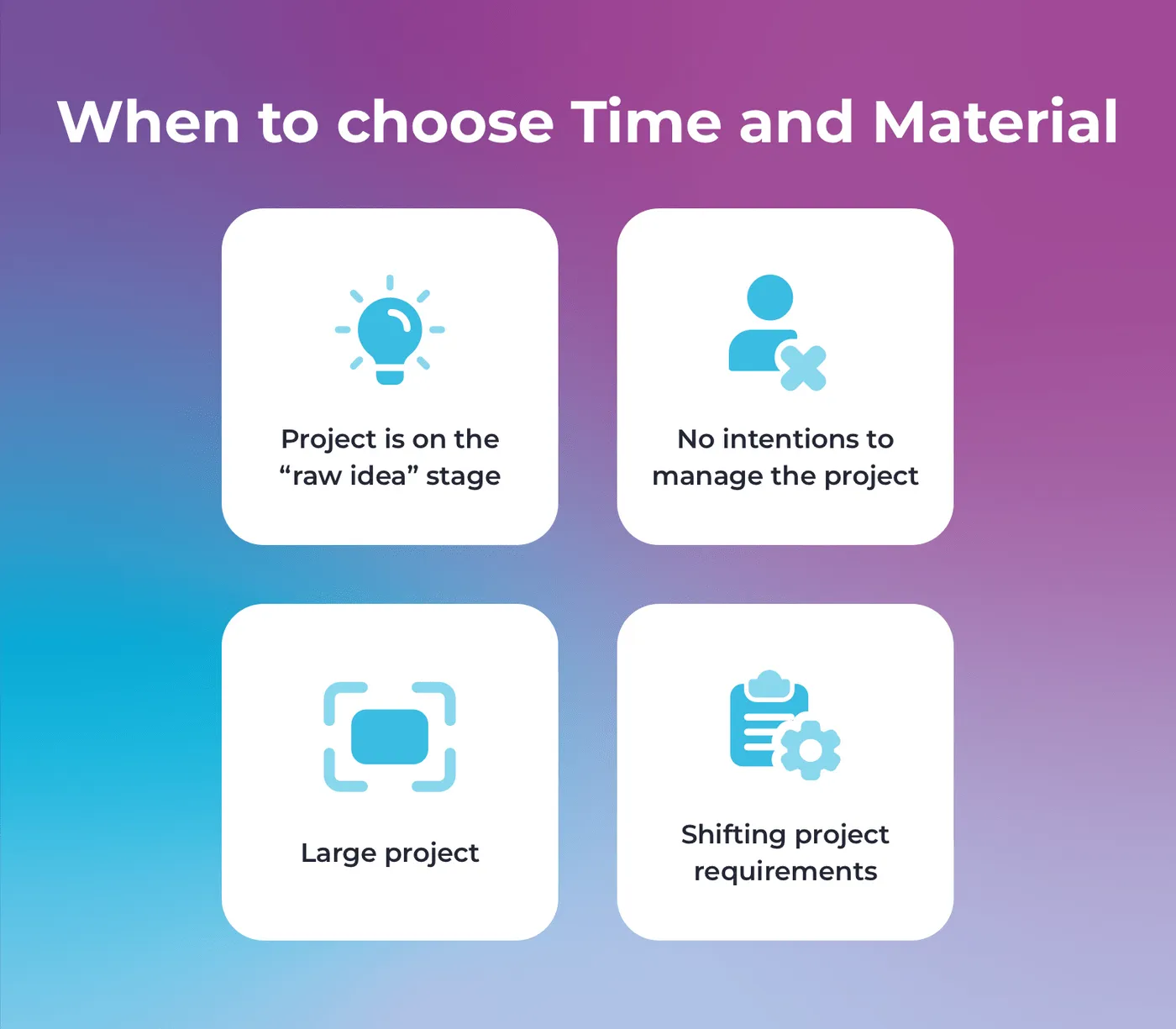 Outsourcing isn’t only about dedicated teams. There are more models that can be suitable for other project types and situations. The most popular approaches are Time & Material and Fixed price models. In this section, we’ll discuss their advantages and pitfalls compared to a dedicated team model.