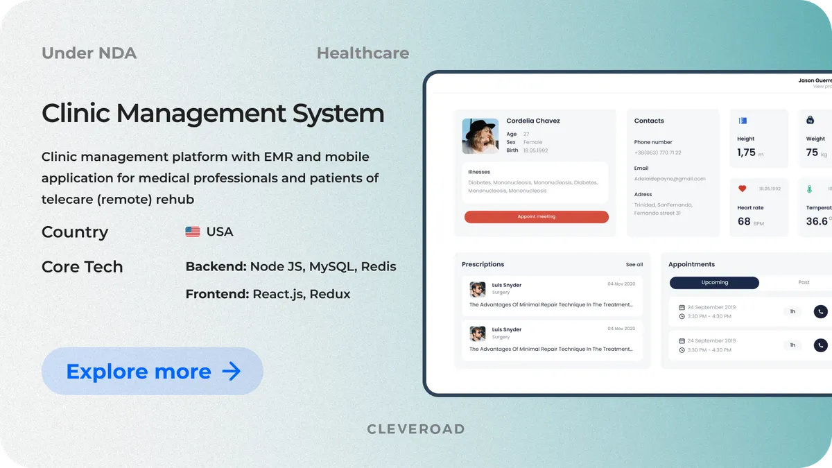 Kindly note that the drawbacks can easily be solved if the vendor pays attention to the flow organization and cooperation details with their clients. Cleveroad is a healthcare outsourcing software development company, attentive to the arrangement of the seamless communication process with you, and quick dealing with any IT issues you may face.