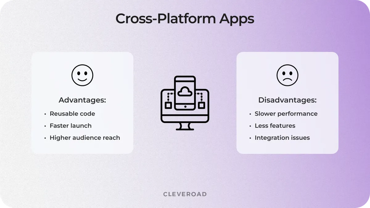 Cross-platform app development services ensure the opportunity to provide great operation, yet access to native apps’ features is lacking. Therefore, it’s an excellent way to build an application with limited functionality yet cover a larger audience, and provide accessibility for multiple OSs from a single code at a lower financial investment.